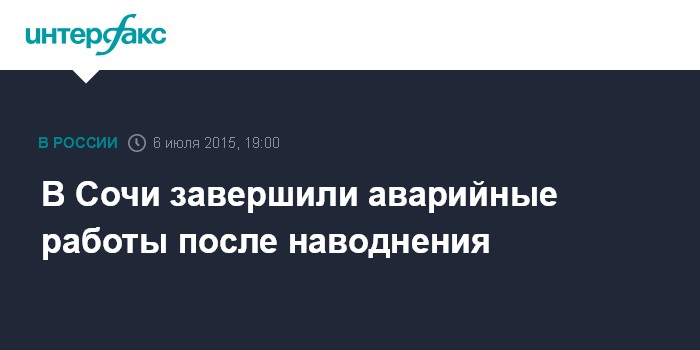 Москва. 6 июля. INTERFAX.RU - Аварийно-восстановительные работы после наводнения в Сочи завершены, но режим ЧС в городе-курорте продолжает действовать, сообщил агентству "Интерфакс" первый заместитель мэра Сочи Виктор Филонов в понедельник.
