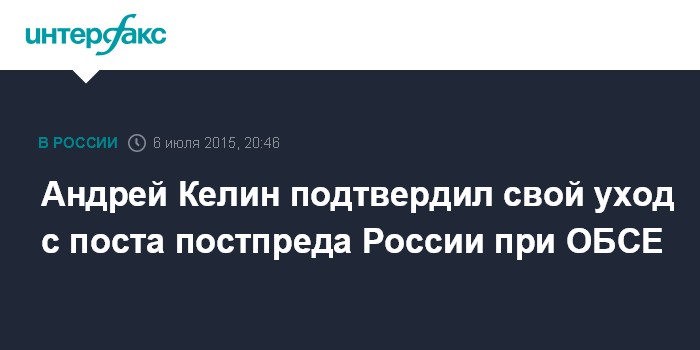 Москва. 6 июля. INTERFAX.RU - Постоянный представитель РФ при ОБСЕ Андрей Келин подтвердил, что покидает свою должность, а его место займет глава департамента информации и печати МИД РФ Александр Лукашевич.