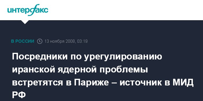 Москва. 13 ноября. ИНТЕРФАКС - Встреча "шестерки" посредников по урегулированию иранской ядерной проблемы пройдет на уровне политдиректоров в Париже в четверг.
