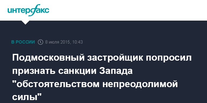 Москва. 8 июля. INTERFAX.RU - Застройщик, связавший возникшие у него проблемы в привлечении финансирования напрямую с западными санкциями против России, добивается признания ситуации форс-мажорной.