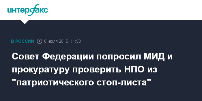 Москва. 8 июля. INTERFAX.RU - Совет Федерации потребовал от Генпрокуратуры, МИДа и Минюста проверить на соответствии российскому законодательству деятельность 12 иностранных неправительственных организаций (НПО), действующих на территории РФ, включенных в так называемый "патриотический стоп-лист".
