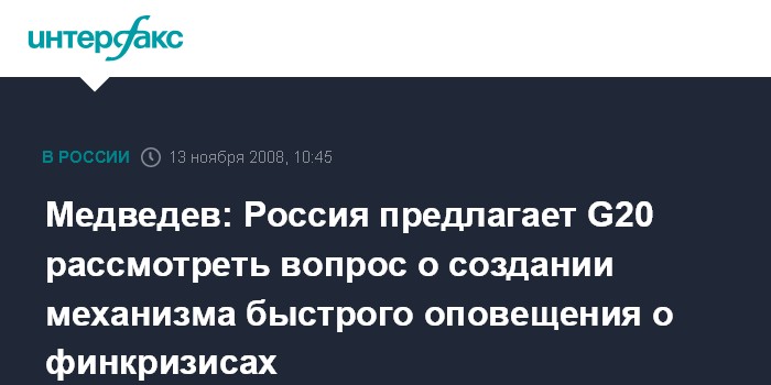 Москва. 13 ноября. INTERFAX.RU - Россия предлагает группе "двадцати" создать механизм быстрого оповещения о финансовых кризисах, заявил президент РФ Дмитрий Медведев.