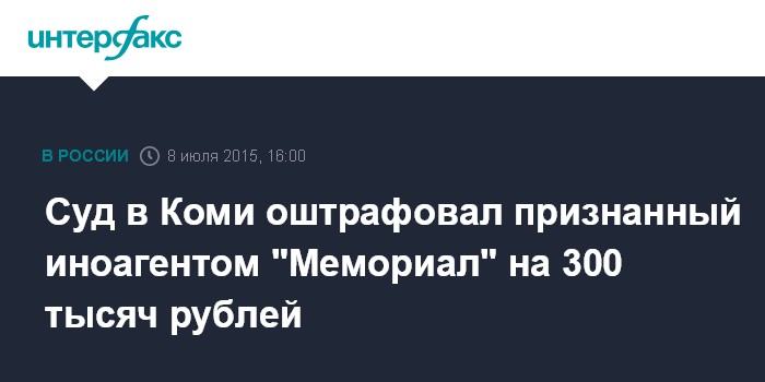 Москва. 8 июля. INTERFAX.RU - Суд в Коми оштрафовал правозащитную региональную комиссию "Мемориал" на 300 тысяч рублей за уклонение от включения в реестр иностранных агентов, сообщили "Интерфаксу" в организации.