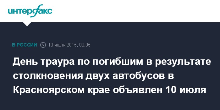 Москва. 10 июля. INTERFAX.RU -День траура по 11 погибшим 9 июля в результате столкновения двух автобусов в Балахтинском районе Красноярского края объявлен в пятницу, 10 июля.