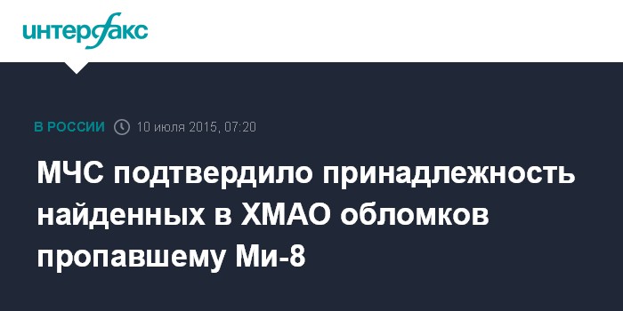 Москва. 10 июля. INTERFAX.RU - Обломки и предметы, найденные в ходе поисков пропавшего в ночь на 3 июля вертолета Ми-8 в Ханты-Мансийском автономном округе, принадлежат этому воздушному судну, сообщили агентству "Интерфакс" в пресс-службе ГУ МЧС по ХМАО.