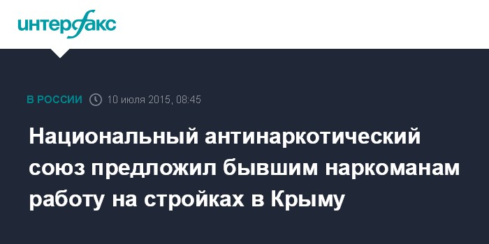 Москва. 10 июля. INTERFAX.RU - Бывших наркозависимых отправят на стройки в Крым в рамках программы ресоциализации, проводимой Национальным антинаркотическим союзом (НАС), сообщили "Интерфаксу" в пресс-службе ассоциации.