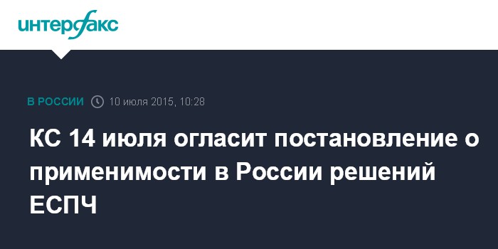 Москва. 10 июля. INTERFAX.RU - Конституционный суд на заседании во вторник, 14 июля, огласит постановление по делу о применимости решений Европейского суда по правам человека в России. Согласно информации на официальном сайте суда, заседание пройдет в 10.00.