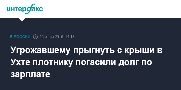 Москва. 10 июля. INTERFAX.RU - В Ухте плотник передумал прыгать с крыши после того, как ему погасили долг по зарплате, сообщили "Интерфаксу" в городской полиции.