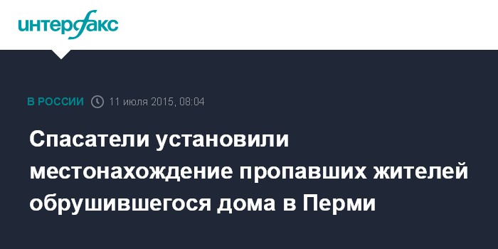 Москва. 11 июля. INTERFAX.RU - Спасатели установили местонахождение троих жителей дома, обрушившегося в Перми, которые, как предполагалось, могут находиться под завалами.