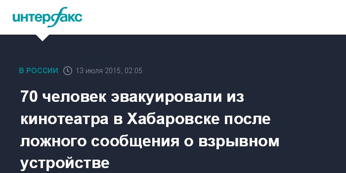 "12 июля около полуночи (17:00 мск) поступило сообщение о том, что в кинотеатре "Хабаровск", расположенном по улице Стрельникова, 4 краевого центра, заложено взрывное устройство. Территория вокруг здания была оцеплена, проводилась эвакуация 70 человек", - говорится в сообщении.