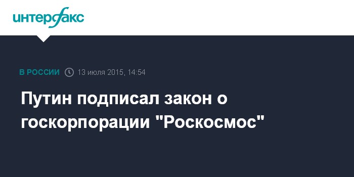Москва. 13 июля. INTERFAX.RU - Президент Владимир Путин подписал Федеральный закон "О Государственной корпорации по космической деятельности "Роскосмос", сообщает в понедельник пресс-служба Кремля.