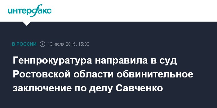Москва. 13 июля. INTERFAX.RU - Генеральная прокуратура России утвердила обвинительное заключение и направила в суд уголовное дело в отношении гражданки Украины Надежды Савченко, сообщает Генпрокуратура РФ в понедельник.