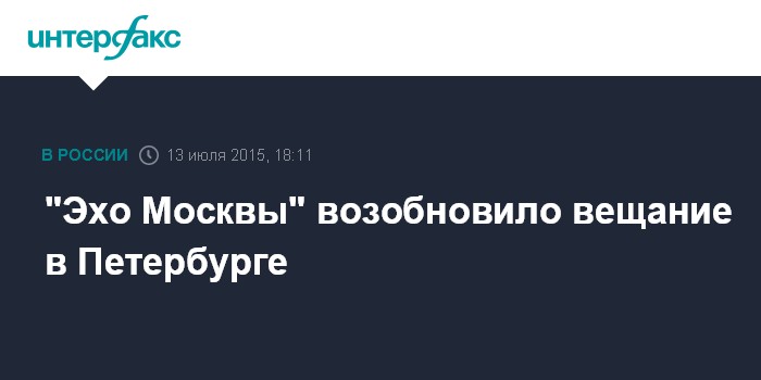 Москва. 13 июля. INTERFAX.RU - Радиостанция "Эхо Москвы" возобновила вещание в Санкт-Петербурге на частоте 91,5 FM, передал корреспондент "Интерфакса" в понедельник.