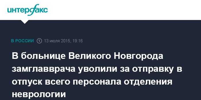 Москва. 13 июля. INTERFAX.RU - Заместитель главного врача Новгородской областной клинической больницы (НОКБ) Нина Лобанова, подписавшая приказ о коллективном отпуске персонала отделения неврологии для больных с острым нарушением мозгового кровообращения НОКБ, уволена, сообщили в понедельник "Интерфаксу" в пресс-службе правительства Новгородской области.