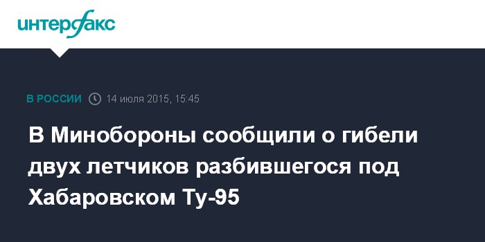 Москва. 14 июля. INTERFAX.RU - Два летчика из экипажа самолета-ракетоносца Ту-95МС, который разбился в Хабаровском крае, погибли, сообщает Минобороны РФ.