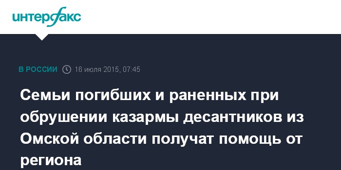 Москва. 16 июля. INTERFAX.RU - Губернатор Омской области Виктор Назаров подписал распоряжение о выделении средств из резервного фонда региона для оказания помощи семьям погибших и раненых в результате обрушения казармы учебного центра ВДВ под Омском.