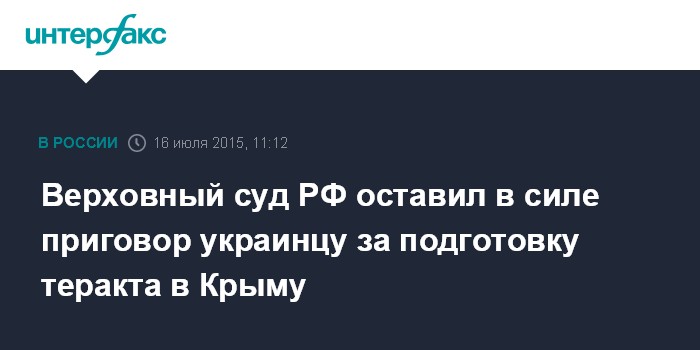 Москва. 16 июля. INTERFAX.RU - Верховный суд РФ признал законным приговор украинцу Алексею Чирнию, осужденному на семь лет строгого режима по делу о подготовке терактов в Крыму.