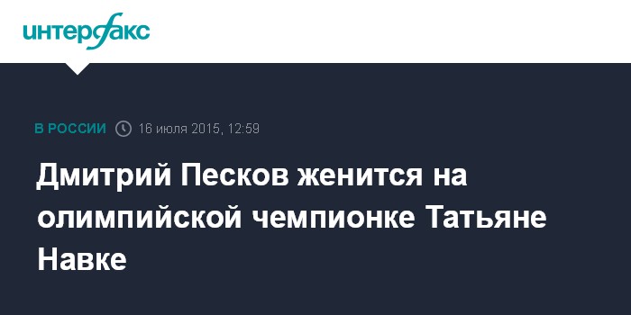 Москва. 16 июля. INTERFAX.RU - Олимпийская чемпионка по фигурному катанию в танцах на льду Татьяна Навка анонсировала на 1 августа свою свадьбу с пресс-секретарем президента России Дмитрием Песковым, сообщает журнал Tatler.