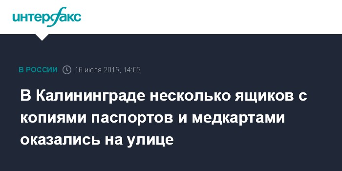 "В Калининграде на улице 1812 года в одном их дворов были найдены коробки с копиями гражданских паспортов и документами о сделках с недвижимостью, а также медицинские карты пациентов стоматологической клиники. Калининградцы сообщили о находке в полицию, посчитав, что это явное нарушение закона "О защите персональных данных", - сообщил "Интерфаксу" заместитель начальника пресс-службы регионального УМВД Вячеслав Кочубей.