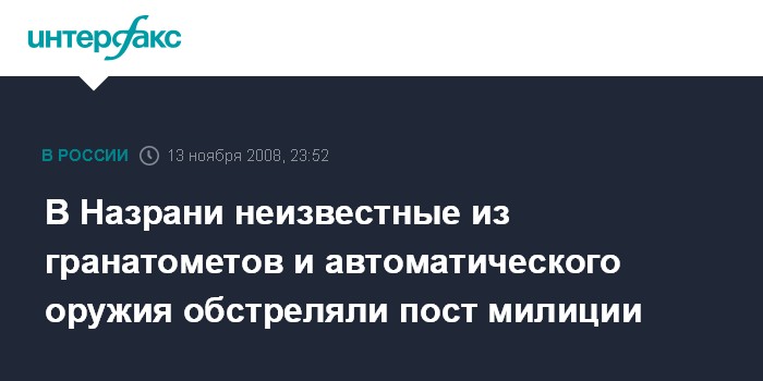 Назрань. 13 ноября. ИНТЕРФАКС-ЮГ - В Ингушетии на окраине города Назрань неизвестными из гранатометов и автоматического оружия обстрелян пост милиции, расположенный на так называемом Экажевском круге.