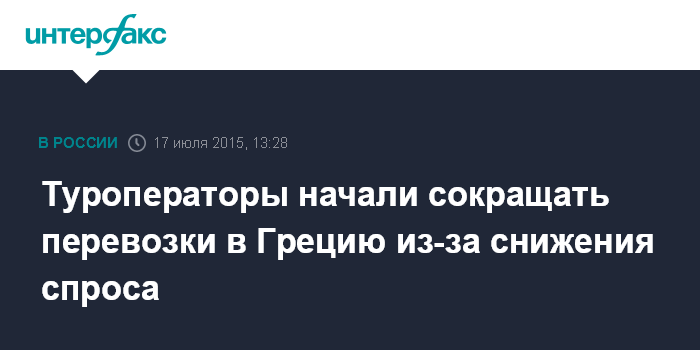Москва. 17 июля. INTERFAX.RU - Российские туроператоры оптимизируют программы перевозки в Грецию из-за снижения спроса на фоне экономических проблем в этой стране, сообщила "Интерфаксу" пресс-секретарь Российского союза туриндустрии (РСТ) Ирина Тюрина.