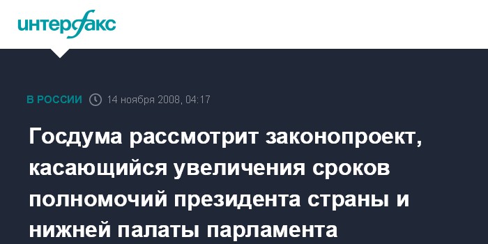 В соответствии с законодательными инициативами президента РФ, предложено продлить сроки полномочий главы государства и Госдумы с четырех до, соответственно, шести и пяти лет. Кроме того, вносятся поправки в Конституцию, связанные с установлением контрольных полномочий Госдумы в отношении правительства РФ.