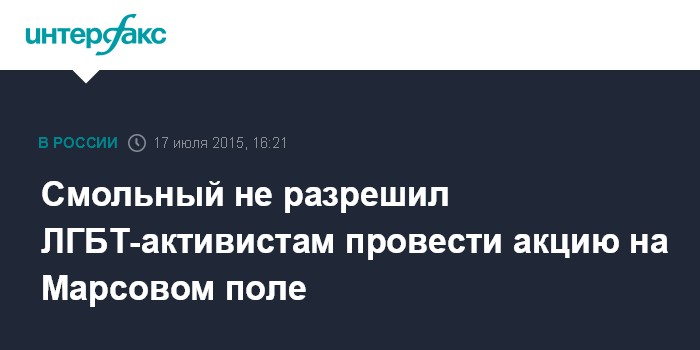 Москва. 17 июля. INTERFAX.RU - Комитет по вопросам законности, правопорядка и безопасности Санкт-Петербурга не согласовал проведение шествия и митинга в поддержку ЛГБТ на Марсовом поле, сообщила пресс-служба организации "Равноправие" в пятницу.