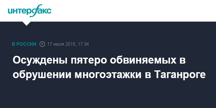 Москва. 17 июля. INTERFAX.RU - Таганрогский городской суд признал виновными пятерых человек, ответственных за обрушение пятиэтажки в Таганроге, где погибли пять человек, сообщила агентству "Интерфакс" в пятницу официальный представитель следственного управления СКР по региону Галина Гагалаева.