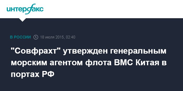 Москва. 18 июля. INTERFAX.RU - Во время очередного раунда российско-китайских переговоров о проведении военно-морских учений "Морское взаимодействие-2015", которые проходили 13-17 июля 2015 года во Владивостоке, подтверждено назначение ПАО "Совфрахт" в качестве генерального морского агента кораблей и судов Военно-морского флота Народно-освободительной армии Китая (ВМС НОАК) в портах Российской Федерации, сообщает Portnews.