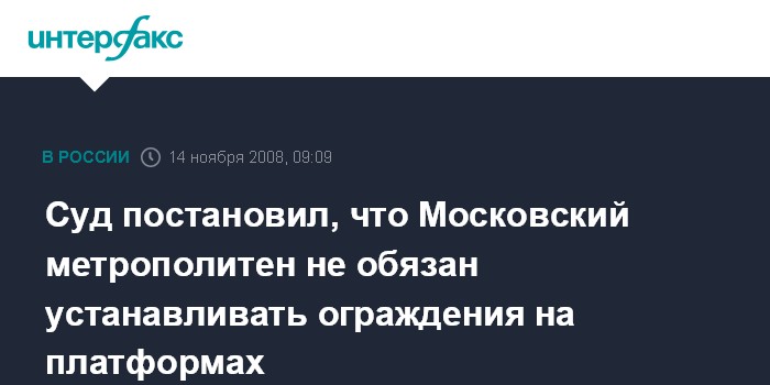 Москва. 14 ноября. INTERFAX.RU - Мещанский суд Москвы не стал обязывать ГУП "Московский метрополитен" выставлять перегородки на платформах станций для предотвращения падения пассажиров на пути.