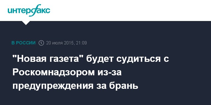 В понедельник стало известно, что ведомство вынесло предупреждение "Новой газете" за публикацию нецензурной брани. "Роскомнадзором выявлен факт использования изданием "Новая газета" (номер 72) (2359, стр. 20 материал "Япономорцы, или Жизнь в прибойной полосе") нецензурной брани", - сообщили в пресс-службе Роскомнадзора.