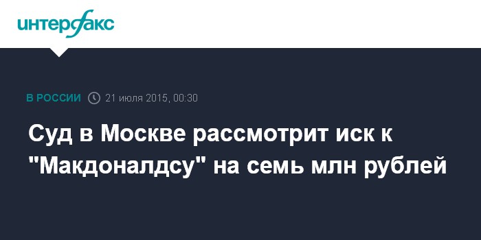 Москва. 21 июля. INTERFAX.RU - Тверской суд Москвы во вторник рассмотрит иск москвича, требующего семь млн рублей в качестве возмещения морального вреда за то, что в одном из ресторанов сети "Макдоналдс" на его трехлетнюю дочь пролили горячий кофе.