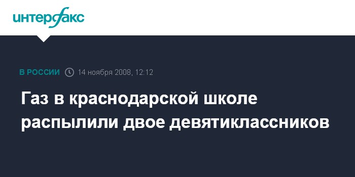 Москва. 14 ноября. INTERFAX.RU - Газ в школе N70 микрорайона Гидростроителей в Краснодаре в пятницу утром распылили двое девятиклассников. "Милиция выявила, что это сделали два ученика школы. Сейчас составлен протокол. К ответственности будут привлекать их родителей", - сообщил агентству "Интерфакс-Юг" начальник пресс-службы УВД города Илья Шакалов.