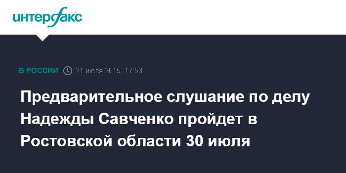 Москва. 21 июля. INTERFAX.RU - Донецкий городской суд (Ростовская область) назначил дату предварительного заседания по уголовному делу гражданки Украины Надежды Савченко, обвиняемой в гибели двух россиян, сообщила агентству "Интерфакс-Юг" пресс-секретарь суда Татьяна Диева.