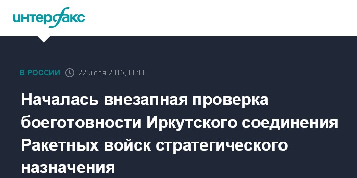 Москва. 21 июля. INTERFAX.RU - Комиссией Командования Ракетных войск стратегического назначения (РВСН) проводится внезапная проверка состояния боевой готовности Иркутского ракетного соединения, сообщил представитель Управления пресс-службы и информации МО РФ по РВСН майор Дмитрий Андреев.
