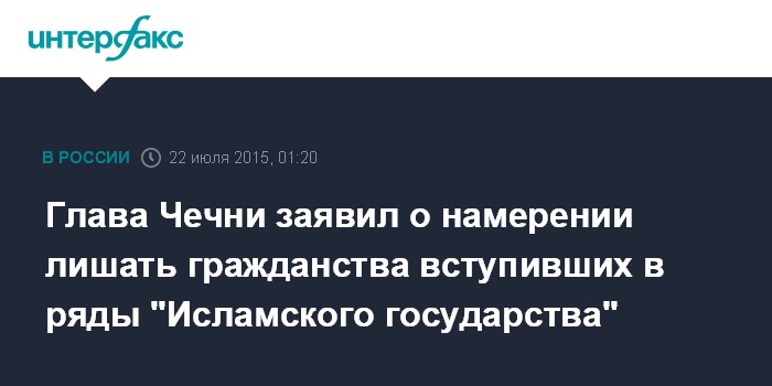 Москва. 22 июля. INTERFAX.RU - Глава Чеченской Республики Рамзан Кадыров считает целесообразным лишать гражданства тех, кто уезжает пополнить ряды террористических организаций.