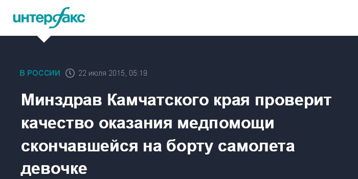 Ранее сообщалось, что четырехлетняя девочка, летевшая с мамой из Петропавловска-Камчатского в Москву на лечение в одной из клиник Минздрава, скончалась во время полета. Ребенка также сопровождал врач-реаниматолог. Во время полета девочка стала задыхаться. Проведенные врачом реанимационные мероприятия результат не дали.