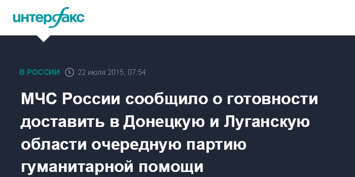МЧС России сообщило о готовности доставить в Донецкую и Луганскую области очередную партию гуманитарной помощи