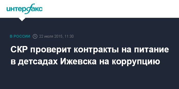 Москва. 22 июля. INTERFAX.RU - Следователи управления СКР по Удмуртии проводят проверку контрактов на закупку питания в детских садах Ижевска, сообщил руководитель управления Владимир Никешкин на заседании антикоррупционного совета при главе республики в понедельник.