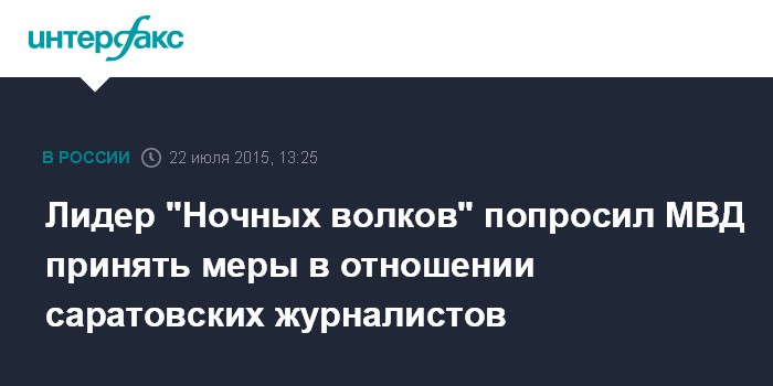 Москва. 22 июля. INTERFAX.RU - ГУ МВД Саратовской области проводит проверку по письму президента всероссийского мотоклуба "Ночные волки" Александра Залдастанова (Хирурга), в котором тот требует принять меры в отношении журналистов саратовской медиа-группы "Общественное мнение".