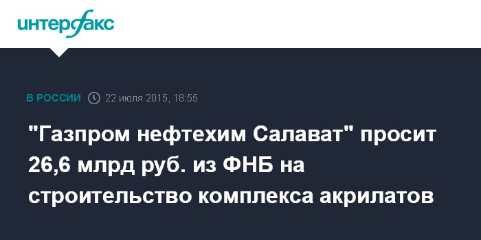 Москва. 22 июля. INTERFAX.RU - "Газпром нефтехим Салават" подал заявку на выделение из Фонда национального благосостояния (ФНБ) 26,6 млрд рублей для финансирования проекта по строительству комплекса акриловой кислоты и акрилатов в Башкирии, сообщил "Интерфаксу" источник, знакомый с планами компании.