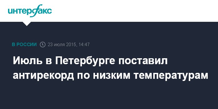 Москва. 23 июля. INTERFAX.RU - Июль в Петербурге устанавливает очередной температурный антирекорд: летний месяц в этом году может запомниться как один из самых холодных за историю наблюдений.