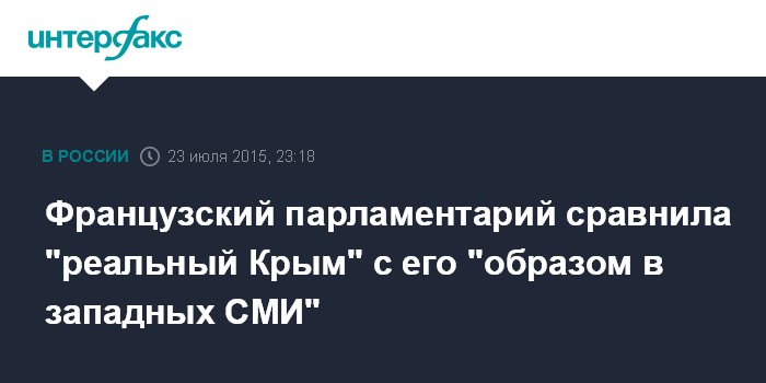 Москва. 23 июля. INTERFAX.RU - Реальная ситуация в Крыму значительно отличается от картины, которая преподносится в СМИ стран Запада, считает депутат парламента Франции Мари-Кристин Даллоз.
