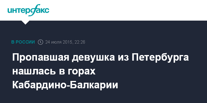Москва. 24 июля. INTERFAX.RU - Благополучно найдена не вернувшаяся вовремя девушка в Черекском районе Кабардино-Балкарии, сообщает в пятницу пресс-служба ГУ МЧС России по КБР.