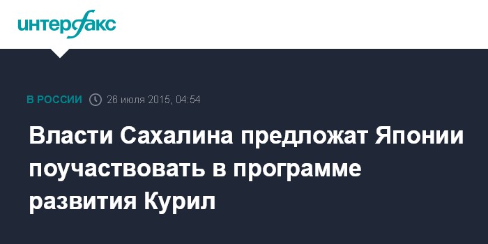 Москва. 26 июля. INTERFAX.RU - Япония сможет участвовать в реализации новой федеральной целевой программы (ФЦП) социально-экономического развития Курильских островов на 2016-2025 годы, принятой правительством РФ, сообщил на пресс-конференции в субботу временно исполняющий обязанности губернатора Сахалинской области Олег Кожемяко.