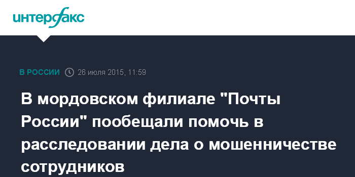 Москва. 26 июля. INTERFAX.RU - УФПС Мордовии информирует о содействии МВД в расследовании дела о крупном мошенничестве, а также назначении врио директора филиала "Почты России".
