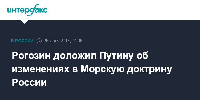 Москва. 26 июля. INTERFAX.RU - Вице-премьер Дмитрий Рогозин в ходе совещания президента Владимира Путина с российским военным руководством сделал доклад об изменениях в Морскую доктрину РФ.