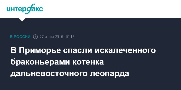 Ранее сообщалось, что пограничники в Приморье обнаружили у границ с КНР годовалого котенка дальневосточного леопарда, который пострадал от рук браконьеров. Животное доставили в Центр реабилитации и реинтродукции тигров и других редких животных в поселке Алексеевка, где провели операцию. В момент, когда леопард попал к ветеринарам, у него была высокая температура. При отсутствии помощи специалистов он мог погибнуть в течение нескольких суток.