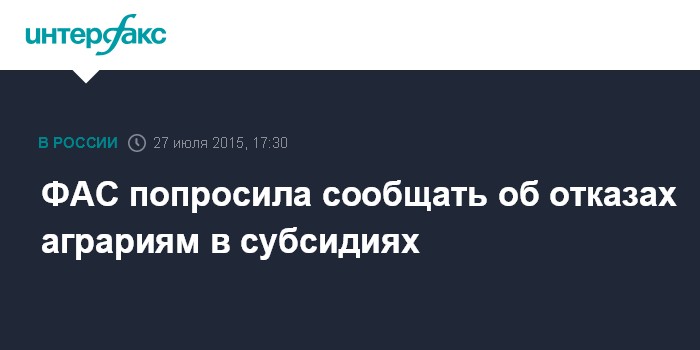 Москва. 27 июля. INTERFAX.RU - Федеральная антимонопольная служба (ФАС) России просит сообщать о случаях отказа в предоставлении сельхозпроизводителям субсидий.