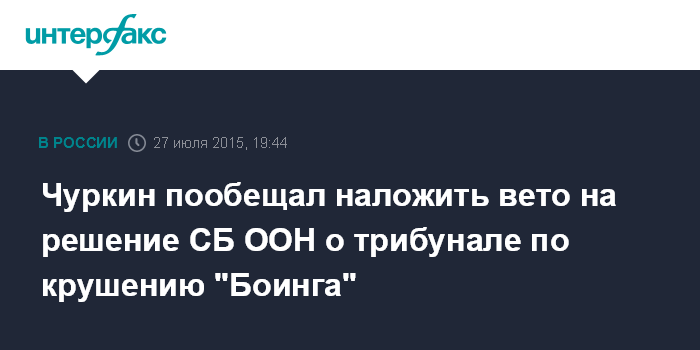 Москва. 27 июля. INTERFAX.RU - Россия наложит вето на резолюцию СБ ООН о создании трибунала по расследованию катастрофы малайзийского "Боинга 777" на востоке Украины, если эта резолюция будет принята большинством голосов членов Совбеза, заявил постпред РФ в ООН Виталий Чуркин.